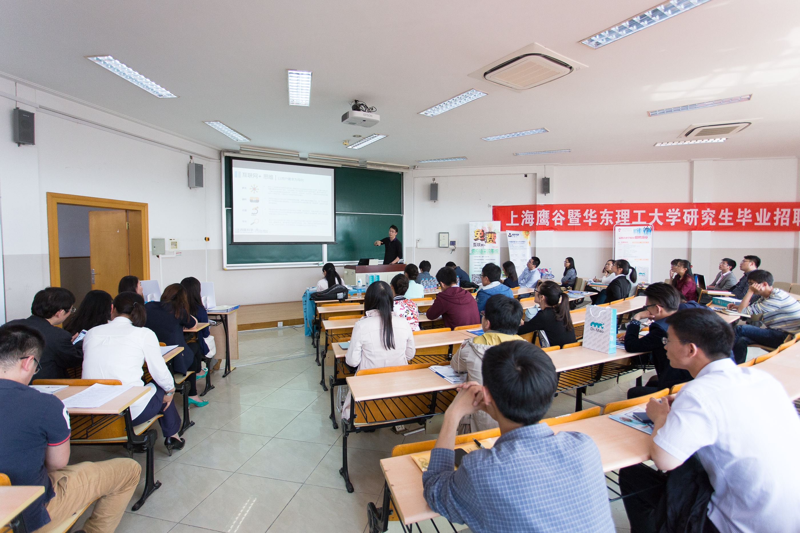 会前,各公司依次播放企业宣传视频。随后,主持人致辞欢迎各公司领导的到来并宣布招聘会正式开始。上海鹰谷信息科技有限公司市场副总监黄东梅女士首先发言,她介绍了公司理念,鹰谷是依托“互联网+”模式,为生物、化工、医药等研发机构提供电子化数据采集服务,帮助用户积累科研大数据,她从公司发展历程、企业服务、典型用户、10亿科研支持计划、合作伙伴和权威认可等六个方面对鹰谷公司概况作了说明。她表示鹰谷虽然年轻,但竞争力强、前景美好,希望同学们积极主动应聘公司的销售经理或产品经理岗位。接着,上海毕得医药科技有限公司研发副总裁张锐豪先生对企业发展情况进行了概述,并以图片的形式展示了公司良好的工作环境和员工丰富多彩的业余活动,殷切希望华理学生踊跃投入到毕得的大家庭中来。随后,上海西陇生化科技有限公司副总经理阿庆德先生从公司的平台服务、营销团队、品牌(及代理品牌)等方面对公司做了简介,同时着重介绍了隶属于公司的毛博士实验室在行业内30年来的成就,其为化学、生化、医药和材料科学等领域的实验室研发及生产提供了集成化解决方案。会上,萨恩化学技术(上海)有限公司和上海迈瑞尔化学技术有限公司相关负责人分别对其企业作了介绍和对所需招聘人才作了说明。最后,上海阿拉丁生化科技股份有限公司营销总监费志锋压轴出场,以诙谐幽默的语言风格介绍了公司情况作并与在场人员亲切互动。他在发言最后强调了公司人力资源管理理念“量才使用、公平竞争、绩效为先”的重要性,并对企业2016年招聘薪酬标准作了说明。各企业宣讲结束后,研究生与企业进行了面对面交流、面试。