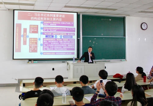 讲座上,陈荣武主要从学习习近平总书记系列重要讲话是重大政治任务、习近平总书记系列重要讲话构成框架和主要内容、如何学习贯彻好习近平总书记系列重要讲话精神三个部分展开。阐述了“中国梦”“四个全面”“五位一体”等党的建设与治国理政的战略布局与战略思想。着重介绍了统领全党的共产主义理想与信仰、统领中华民族和全国人民的中国梦和“两个一百年”奋斗目标,特别是党的十八届六中全会的重要论述。并结合大学生实际,介绍了党员理想信念教育、高校意识形态教育和“四个自信”新增加的文化自信。为增强学习的实效性,专门介绍了“实质”“目标”“理念”“路径”等贯通在习近平总书记系列重要讲话中的核心要素。最后,他结合习近平总书记的若干讲话精神,鼓励学生党员等立足实际,学好专业知识、不断实践锻炼,提高为人民服务的本领。