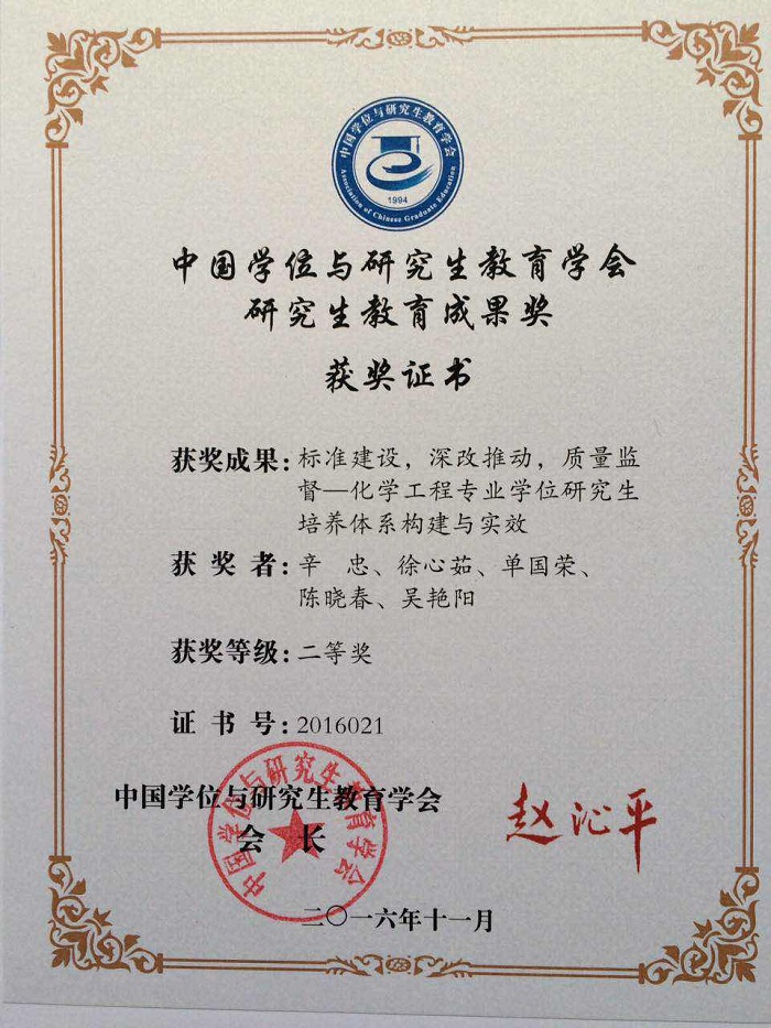 副校长辛忠教授主持的、徐心茹等教授参与完成的《标准建设,深改推动,质量监督—化学工程专业学位研究生培养体系构建与实效》项目荣获全国二等奖。中国学位与研究生教育学会研究生教育成果奖于2014年设立,每两年评选一次,奖励在研究生教育理论研究与教育教学实践工作中开拓创新、做出突出贡献、取得显著成效的集体和个人。