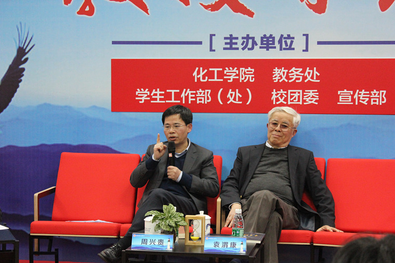 在现场问答交流环节中,同学们就化工领域就业方向、未来规划、创新研究等方面向主讲嘉宾和现场其它嘉宾进行提问,三位主讲嘉宾、黄婕处长和赵玲院长对问题进行了悉心回答,并为同学们的发展提出宝贵意见。如面对本科被动学习到研究生主动学习的转换这一问题,周兴贵认为应将知识和能力综合起来,基础知识学好并加强自身能力培养,在研究时展现出来,并表现出创新意识,找到追求的目标。