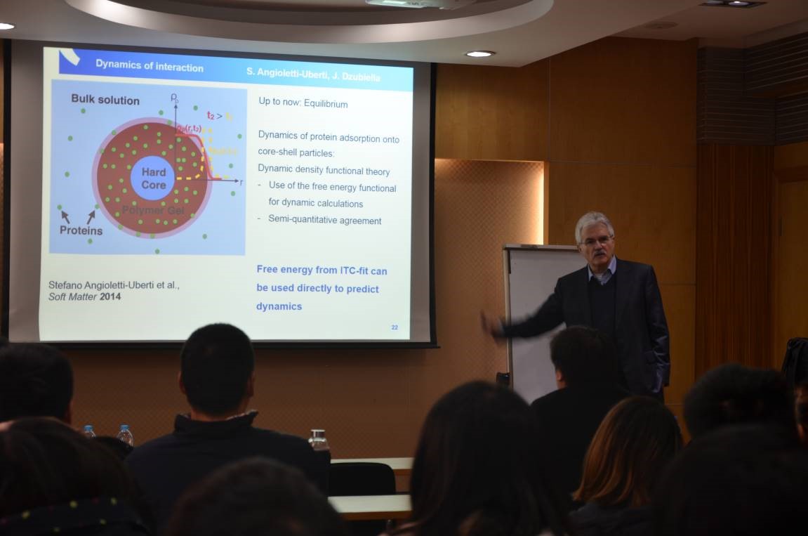 师生带来题为“Self-assembly of Proteins with Charged Polymers: Comparing experimental Data to Theory and Simulation”的学术报告(图1)。他的报告主要是关于聚电解质刷与蛋白质的相互作用,通过理论分析和计算机模拟,进一步加深了对其相互作用机理的理解。Ballauff教授丰富的知识和深入浅出的介绍,使免费黄色网站