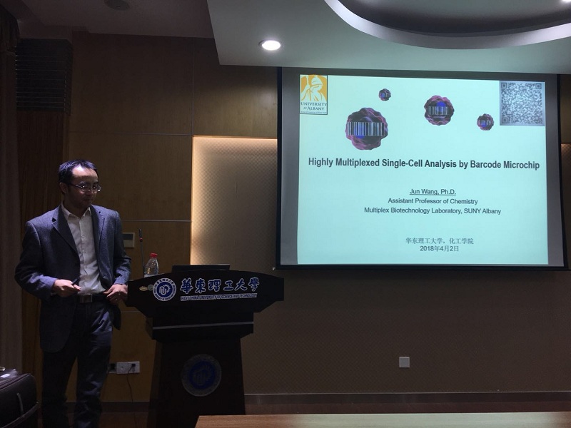Jun Wang教授主要介绍了他在美国的学习与教学生涯,并从两个方面向我们介绍了他们团队最近几年的研究方向。主要是基于对单个细胞的分析与研究,从而去理解大多数多细胞体系的本质。通过使用条形码微流控芯片来定量地研究细胞因子的分泌物,从而通过RNA序列来自发测量单个巨噬细胞的全组基因表达。同时介绍了他们团队创新性的编码技术,设计了一种微米级的二维码,在未来的加密与解码方面具有极具前景的应用。