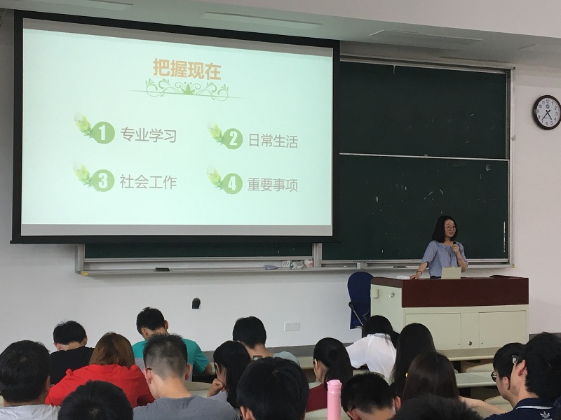 2016级年级大会在B100召开,2016级辅导员强莉主持会议。