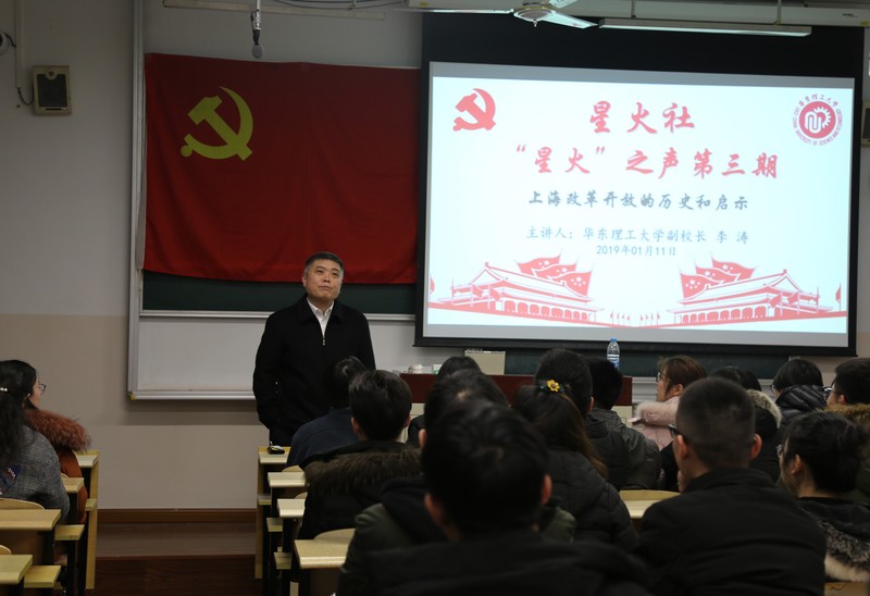 副校长李涛以《上海改革开放启示录》为题,给研究生党员骨干全面介绍了上海市改革开放的历史脉络,为同学们梳理出一幅“上海——时代中奋进”的蓬勃图景,给大家带来了关于学习领会海派历史中艰苦创业,曲折发展,辉煌成就的精彩一课。学院部分教工党支部党员也一起聆听的讲座。院党委副书记高艺霞主持了本次党课。