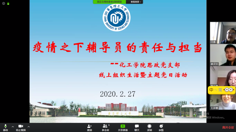 思政党支部通过网络视频会议平台举行了主题为“疫情之下辅导员的责任与担当”的线上组织生活和党日活动,全体支部成员参加了本次云组织生活。