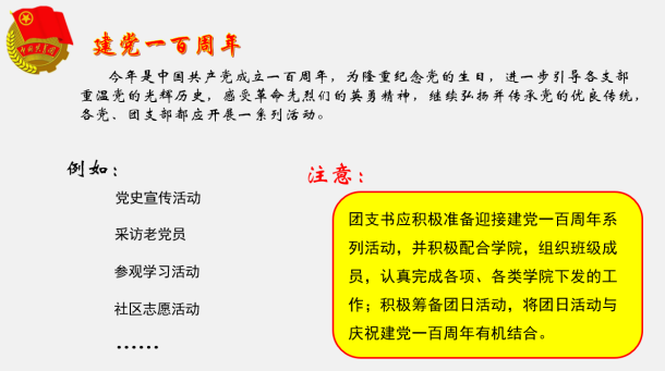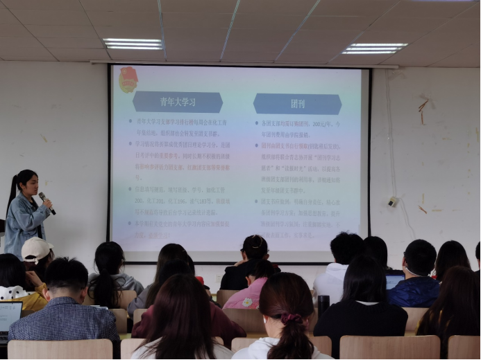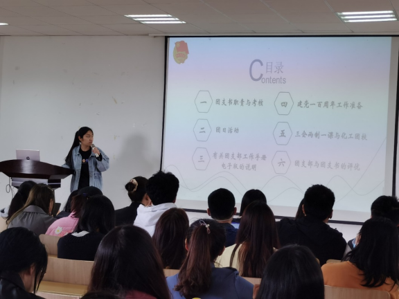 之后对于本学期实行的新政策进行了解读。首先,为方便团支书记录支部活动,对电子版团支部工作手册进行了简单介绍,并指出团支部工作手册填写过程中需要重点注意的部分。然后,强调了今年作为建党一百周年的重要历史意义,同时对于开展建党一百周年的团支部活动提出了一些建议。接着,对“三会两制一课”制度进行了详细的解释,帮助团支书们健全完善支部制度,同时介绍了化工团校,鼓励团员、入党积极分子等积极参加团校活动。