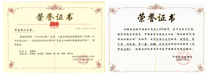 积极贯彻落实习近平总书记关于传承发展中华优秀传统文化的重要讲话和指示批示精神,坚持守正创新,创造性将中华优秀传统文化转化为思政育人力量,创作了《江城必胜中国必胜》《百年再启航》《华理芳华》等有京剧元素的作品,参与师生100余人次。作品歌颂伟大抗疫精神、弘扬伟大建党精神、厚植爱校荣校情怀,引导青年践行社会主义核心价值观,多次得到校内外媒体报道,其中《百年再启航》在中国教育电视台播出,入选全国高校思政工作网《百年珍贵记忆——全国高校庆祝中国共产党成立100周年原创精品档案》。