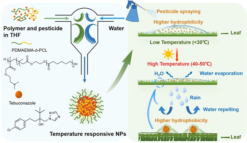 本研究以温度响应共聚物聚-(2-(二甲基氨基)乙基甲基丙烯酸酯)-b-聚(ε-己内酯)(PDMAEMA-b-PCL)为载体,通过瞬时纳米沉淀技术高效制备了具有温度响应、高叶片粘附以及高载药率的纳米农药制剂,具有良好的稳定性。与市售制剂相比,聚合物的包裹改善了戊唑醇的沉积效果,与叶面接触角降低了40°。由于纳米粒子的小尺寸效应和范德华相互作用,其抗雨水冲刷效果比市售制剂提高了37%。与商业制剂相比,戊唑醇纳米粒子对斑马鱼的急性毒性降低了25倍以上,这表明此纳米制剂具有良好的生物相容性。这项工作有望增强农药液滴的沉积和附着力,最大限度地提高农药的利用率,解决农药应用难题之一。