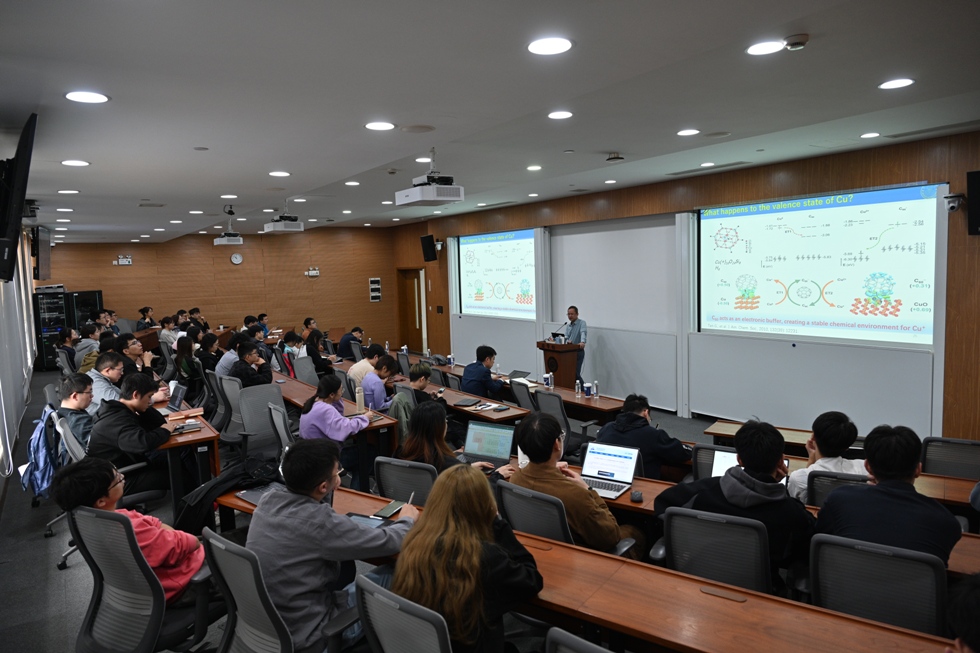 报告中,谢院士从“张力释放”和“局域芳香化”这两个稳定含相邻五元环的新型富勒烯的原理出发,详细阐述了富勒烯作为单分子器件的特性,以及其作为电子受体材料或电子缓冲材料在催化反应中的促进作用。谢院士还介绍了团队在富勒烯促进铜催化剂选择性加氢制醇方面的研究工作。这次报告引发了与会师生们的热烈讨论。谢院士耐心解答了与富勒烯包覆铜颗粒催化剂的活性位点以及富勒烯的电子缓冲性对不同金属能级的搭配等问题,并且通过分享团队研发过程中所面临的各种困难,鼓励大家坚定信心,勇于尝试,不断开展前沿性研究,为免费黄色网站