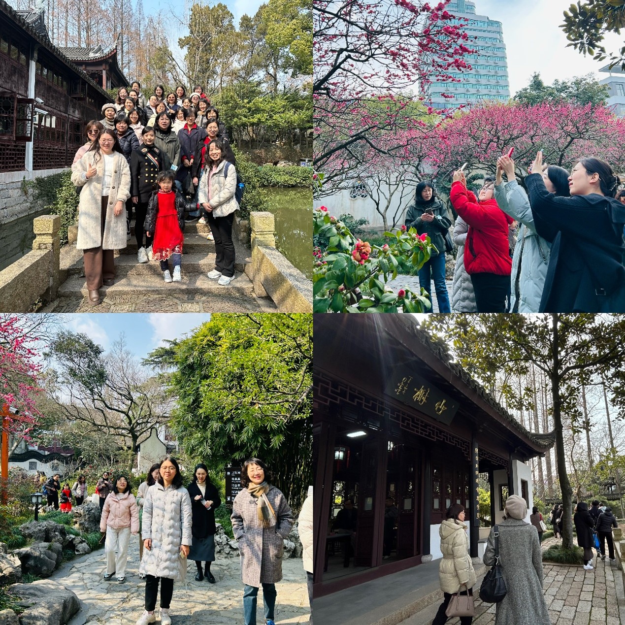 活动伊始,大家来到了位于青浦区的曲水园,开启美好的踏青游园时光。曲水园,取王羲之《兰亭集序》中“曲水流觞”之意,是上海五大园林之一。园内建筑以青瓦、白墙、青砖构成,园中溪水贯之其间,曲流满园,水到之地,一石一水,一亭一阁,尽皆成趣。阳春三月的曲水园,几处红梅开的正艳,玉兰花也如期绽放,白墙红梅,洞门花窗,大家游走在春日的芳菲里,赏一场春花,留满心欢喜。