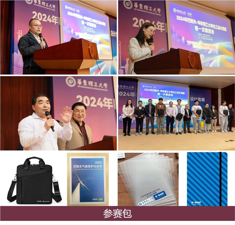 大会第一阶段,校企双方代表分别进行致辞。李宁作为企业代表介绍了巴斯夫公司中国区的基本概况,表达了巴斯夫公司对华理学子的期望,并预祝参赛学生取得好成绩。司忠业代表学校向巴斯夫表示衷心感谢,感谢巴斯夫对青年学子成长和本次大赛的大力支持。他指出,全国大学生化工设计竞赛是全国化工类专业级别最高、影响力最大、参赛高校最多的全国大学生赛事,有助于学校全面落实“卓越工程师教育培养计划”,有利于培养学生的创新能力素养。随后,巴斯夫企业代表和校方代表共同为参赛队员发放参赛包,参赛包由巴斯夫设计和捐赠。