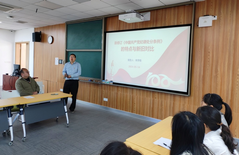 朱学栋以“新修订《中国共产党纪律处分条例》的特点与新旧对比”为题讲授纪律党课。他从新修订《条例》的背景与意义讲起,着重阐述了新修订《条例》的主要特点、新旧《条例》内容对比和新《条例》的亮点,并指出了新《条例》对党员领导干部和基层党组织建设的影响,以及对党风廉政建设和反腐败斗争、对全面从严治党的重要推动作用。他强调,全体党员要把学习贯彻《条例》作为重要政治任务,把《条例》学深学透,使廉洁自律规范内化于心、外化于行,守住纪律“底线”、不越“红线”,切实以学纪、知纪、明纪、守纪的优良纪律作风保障学院事业高质量发展。