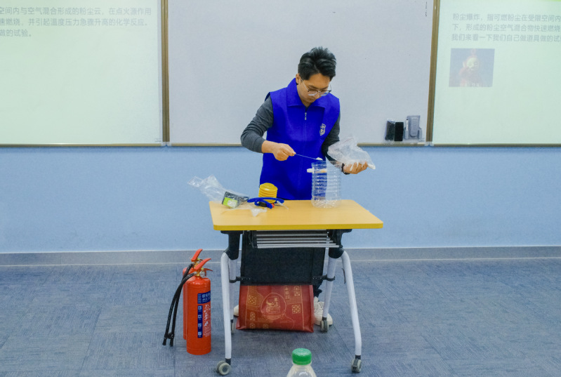 活动中,消防志愿者顾剑峰以“身边的危险日化品”为主题,通过生动实验揭示安全隐患。他现场演示了“自热包破损遇水反应”实验:破损材料遇水后剧烈沸溢并喷溅,直观展现了不当操作的危害性。此外,粉尘爆炸实验让师生近距离认识到固体化学物质的风险。顾剑峰强调:“科学认知是避险的第一步,实验教学能让安全知识深入人心。”