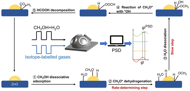 实验结果表明,Cu-Zn界面协同作用在催化过程中起着决定性作用:甲醇在Cu位点上优先吸附解离形成甲氧基(CH3O*),而ZnO主要负责水分子的吸附。关键中间体甲酸盐(HCOO*)的形成被证实是通过甲氧基与表面羟基的相互作用实现的,且其C-H键中的氢原子来源于甲醇分子而非水分子。相敏检测技术进一步揭示甲氧基脱氢步骤是该反应的速率控制步骤。程序升温表面反应实验排除了CO路径的可能性,证实甲酸盐直接分解为CO2和H2的路径主导整个反应过程。此外,通过碳同位素示踪实验明确了表面碳酸盐物种的旁观者角色。这些发现不仅深化了对MSR反应机理的理解,更为设计高效铜基制氢催化剂提供了重要的理论依据。