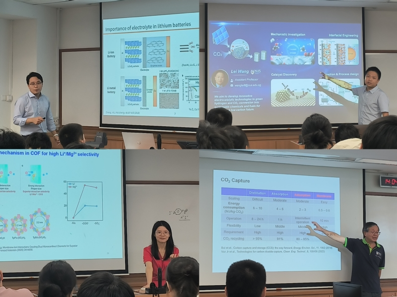 在新加坡国立大学化学与生物分子工程系,Sang Cheol Kim副教授介绍了其在人工智能加速锂离子电池电解液设计和基于电化学反应调控pH实现低能耗CO2吸收解吸的最新研究进展;汪磊副教授介绍了电催化研究前沿,从电化学的基本原理出发讲解了电化学反应装置的设计原理以及电催化反应的技术优势;张岁教授讲述了她带领团队在新加坡水资源循环利用、海水淡化、温室气体治理等方面以膜技术为核心的解决方案;校友姜建文教授介绍了如何融合传统分子模拟和人工智能建模新方法实现材料构效关系的精准建模与高通量定向筛选设计。
