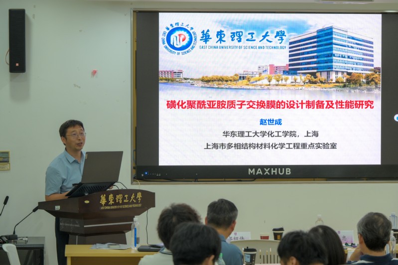 赵世成教授作了题为“磺化聚酰亚胺质子交换膜的设计制备及性能研究”的学术报告。他从分子结构设计与微观相分离调控原理出发,创新提出了基于磺化度精细控制与交联网络构建的协同增强策略,成功制备了一系列高性能磺化聚酰亚胺质子交换膜,显著提升了材料的质子电导率、机械强度及尺寸稳定性,扩展该材料在氢燃料电池、液流电池及电化学传感器等高技术领域中的应用前景。