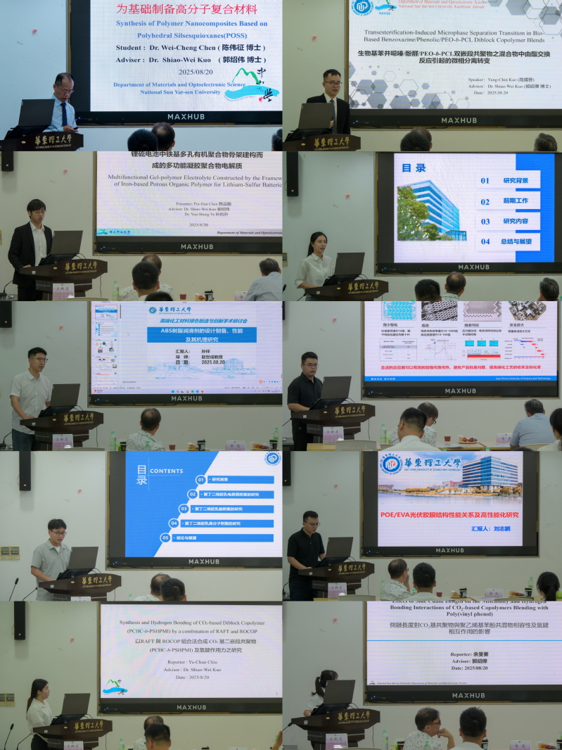 的多名研究生分别作了题为“以双官能基-倍半硅氧烷笼状寡聚体为基础制备高分子复合材料”“噁嗪结构与抗菌性能的构效关系及改性聚乙烯复合材料的制备”“生物基苯并噁嗪/酚醛/PEO-b-PCL双嵌段共聚物之混合物中由酯交换反应引起的微相分离转变”“基于微反应器的丹参酮ⅡA磺酸钠的连续化制备过程研究”“用于锂硫电池的铁基多孔有机聚合物骨架多功能凝胶聚合物电解质”“ABS树脂润滑剂的设计制备、性能及其机理研究”“利用RAFT聚合合成不同链段之二氧化碳基嵌段共聚物及其分子间氢键作用力之研究”“EVA/POE光伏胶膜结构性能关系及高性能化研究”“聚丁二烯胶乳粒径调控策略与附聚机理的研究”等学术报告,为攻克相关技术难题提供了新思路,双方积极研讨,碰撞思想,凝聚共识,并就高端化工材料未来发展进行了深入探讨。